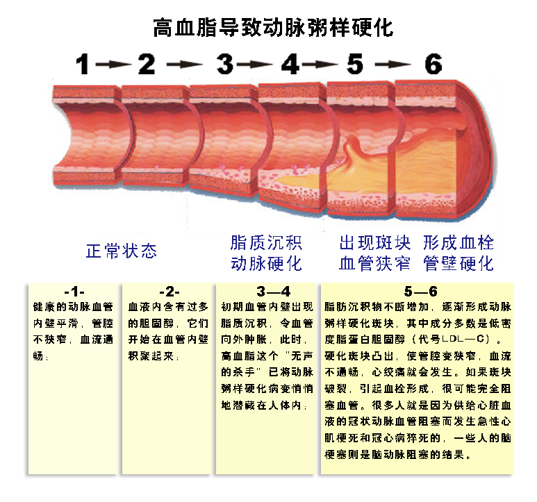 1、 健康的动脉血管内壁平滑,管腔不狭窄,血流通畅; 2、 血液内含有过多的胆固醇,它们开始在血管内壁积聚起来; 3—4、初期血管内壁出现脂质沉积,令血管向外肿胀,此时,高血脂这个“无声的杀手”已将动脉粥 样硬化病变悄悄地潜藏在人体内; 5—6、脂肪沉积物不断增加,逐渐形成动脉粥样硬化斑块,其中成分多数是低密度脂蛋白胆固醇(代号 LDL—C)。硬化斑块凸出,使管腔变狭窄,血流不通畅,心绞痛就会发生。如果斑块破裂,引起血栓形 成,很可能完全阻塞血管。很多人就是因为供给心脏血液的冠状动脉血管阻塞而发生急性心肌梗死和冠 心病猝死的,一些人的脑梗塞则是脑动脉阻塞的结果。